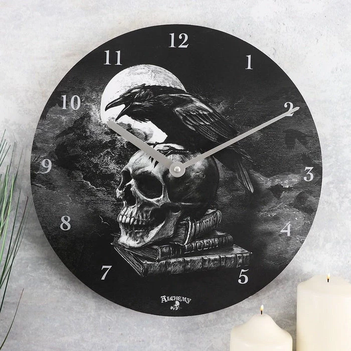 This bold clock design featuring a skull and a raven was inspired by the work of Edgar Allen Poe.