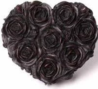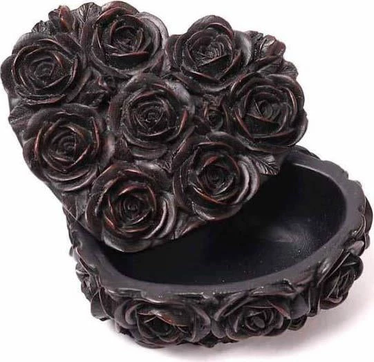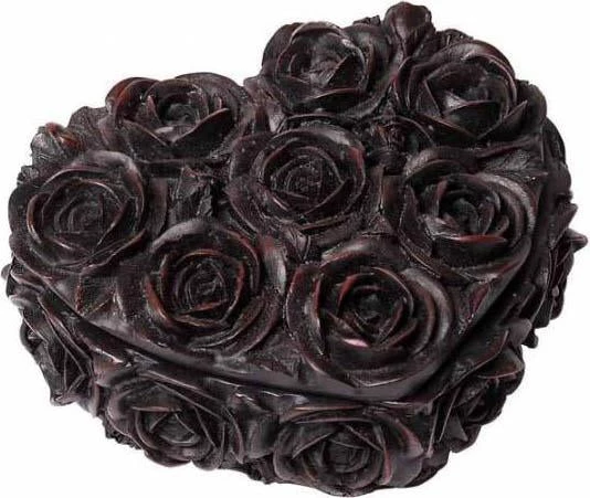 Matte Black finished resin trinket box, heart shaped with rose decoration.