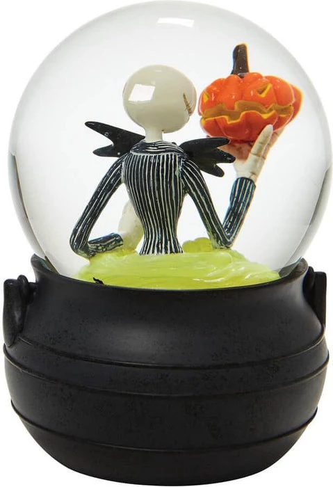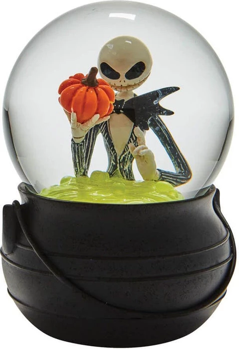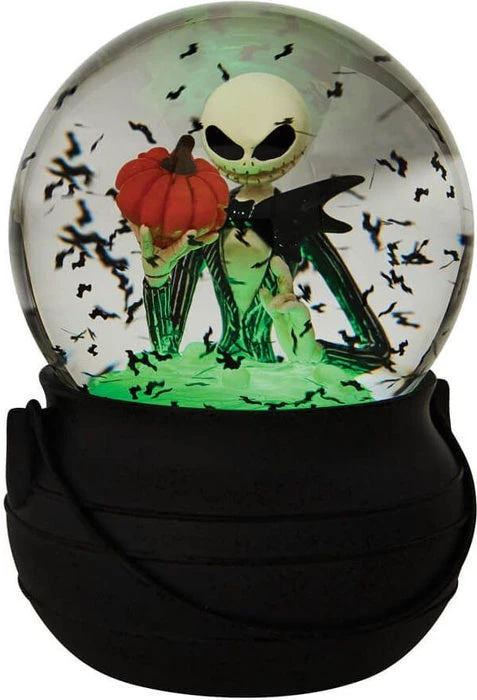 This fully sculpted snow globe features the pumpkin king, Jack Skellington, rising from a lit cauldron and casting a toxic green glow while bats glitter and dance around him. Eerie and enchanting, this gorgeous globe will bewitch your heart! A must have addition to any Nightmare Before Christmas collection!
