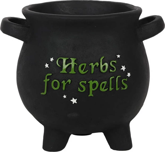 A large resin plant pot shaped like a witch’s cauldron. Features raised ‘Herbs for spells’ text accented by a dusting of stars. Perfect for any green witch’s garden.ย