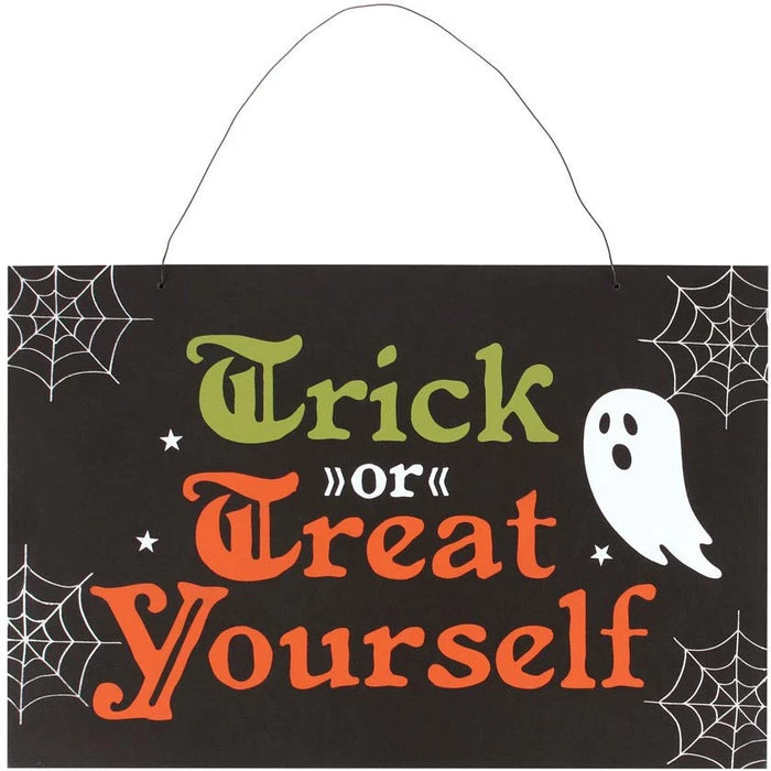 This Halloween themed hanging sign features the text ‘Trick or Treat Yourself’ with cobwebs hanging from its corners and a spooky ghost emerging from the side. This sign would be the perfect addition to any Halloween themed party or home.