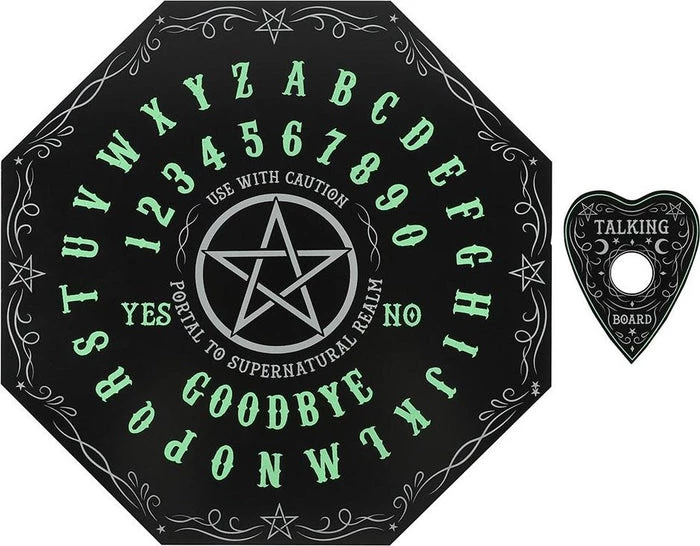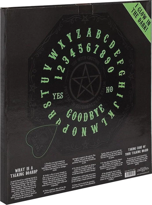 An octagon shaped spirit board with a Pentagram design and glow in the dark letters and numbers. Comes with a planchette for readings. This spirit board is designed for light-hearted entertainment and is not a professional tool for making spiritual connections.