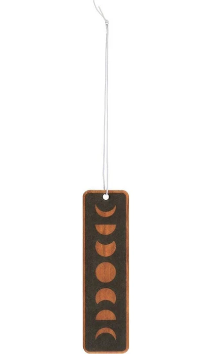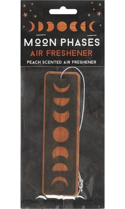This moon phase air freshener has the scent of juicy peach and is perfect for hanging in the car or in a room to create a fresher atmosphere. Printed with moon phases on a faux wood background.