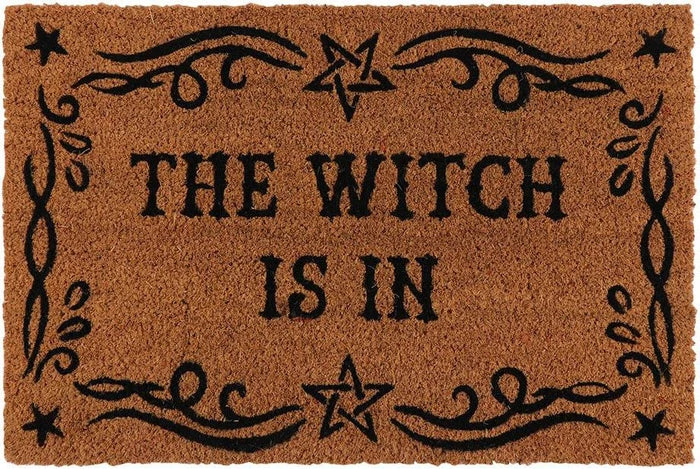 A natural coir doormat with printed ‘The Witch Is In’ text and a flourished border. Makes a fun welcome at the front door of any witch’s home.ย
