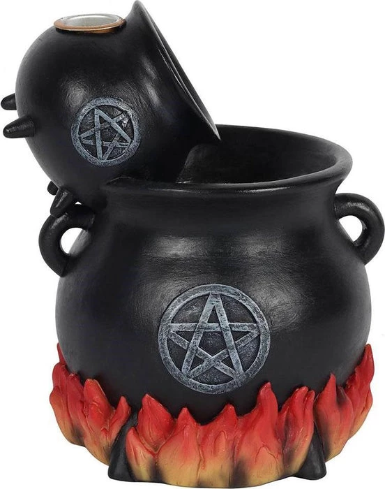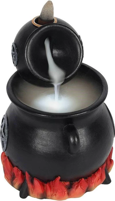 Place a backflow incense cone on top of this resin cauldron burner and watch the smoke gently pour between cauldrons. Accented by flames and a distressed silver-effect pentagram design and finished with a light to create an outstanding smoke effect.