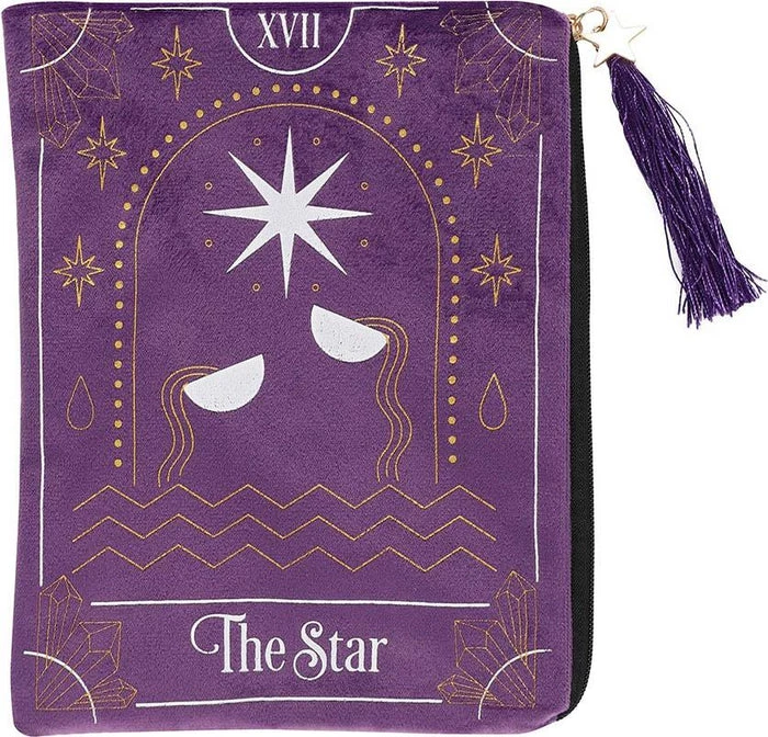 This velvet zipper pouch is the perfect place to keep tarot decks, crystals, beauty products and other treasures. Features a stunning white and gold star tarot card illustration on the front and a matching tassel and gold star charm on the zipper.ย
