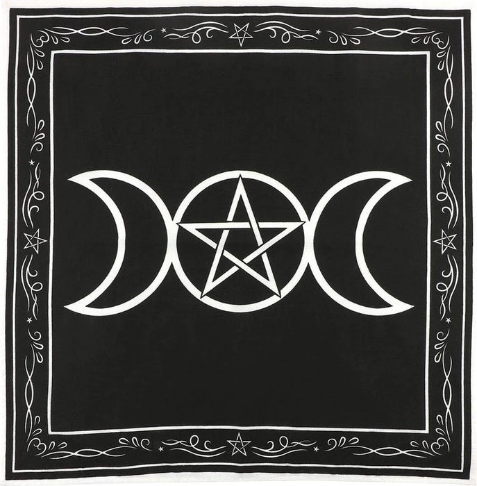 Channel the power of the mother, maiden and crone with this cotton altar cloth with printed triple moon and pentagram design. A flourished white border finishes off this contemporary style.