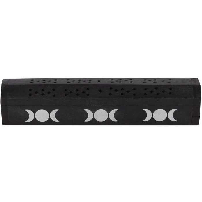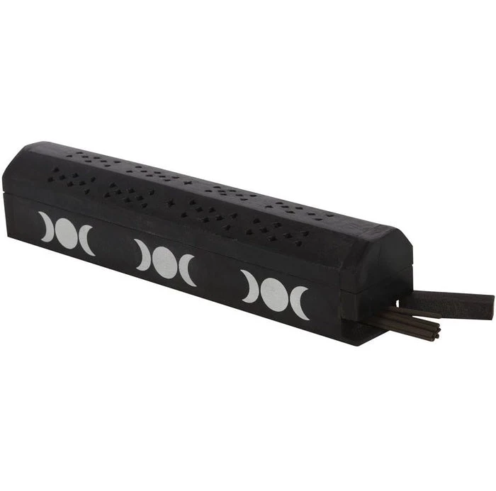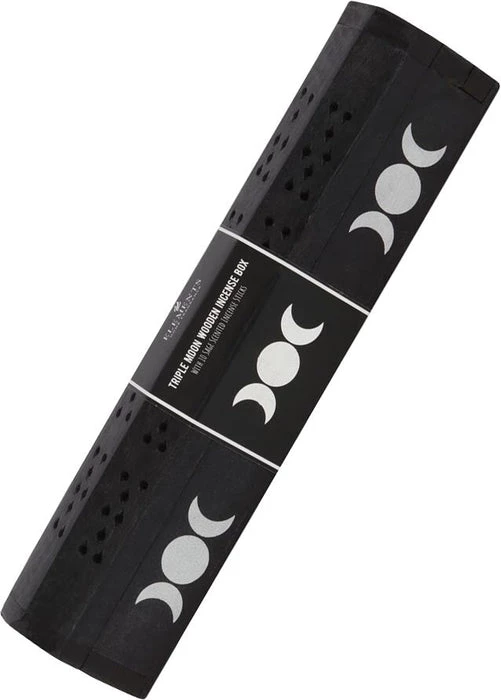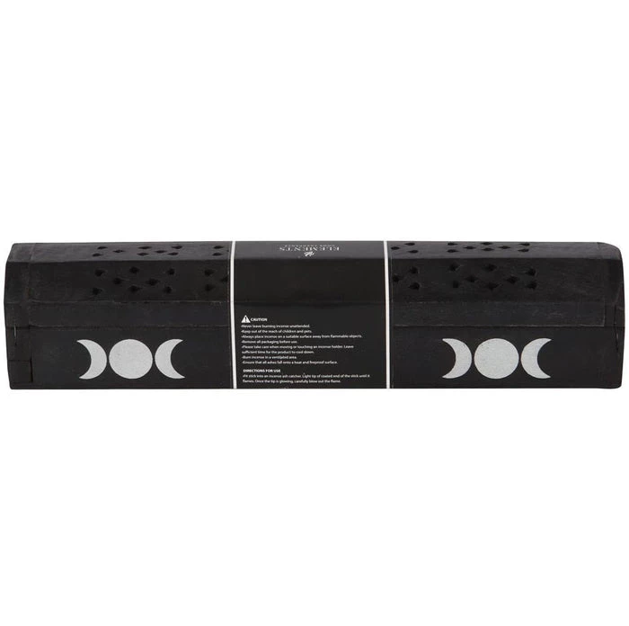 This incense gift set includes 10 sage fragranced incense sticks in a mango wood box. Printed with white triple moons, this box doubles as both an incense holder and storage.ย