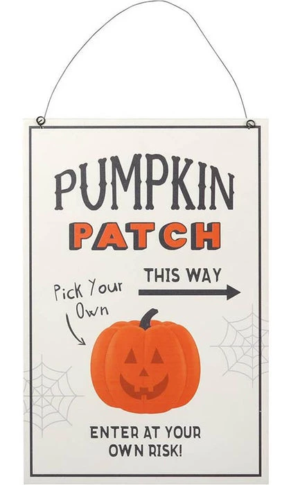 With Halloween becoming bigger year after year, this light-hearted hanging sign is sure to get the season off to a spooky start. A smiling jack-o’-lantern, spider webs and an arrow directs visitors to pick their own pumpkins. Designed by Something Different Wholesale and part of the Halloween range of gifts and home dรฉcor.