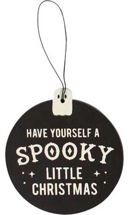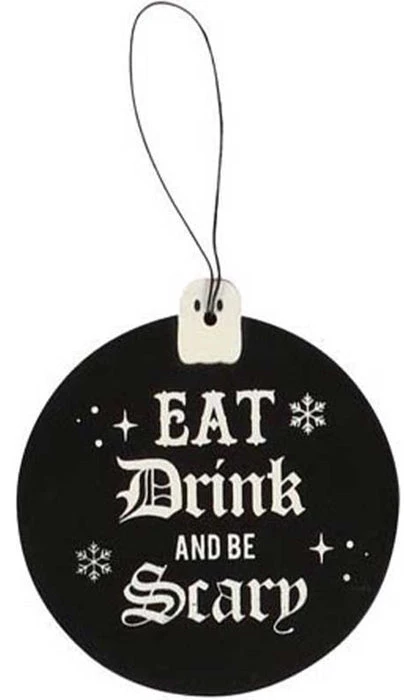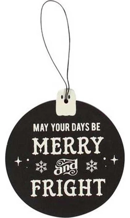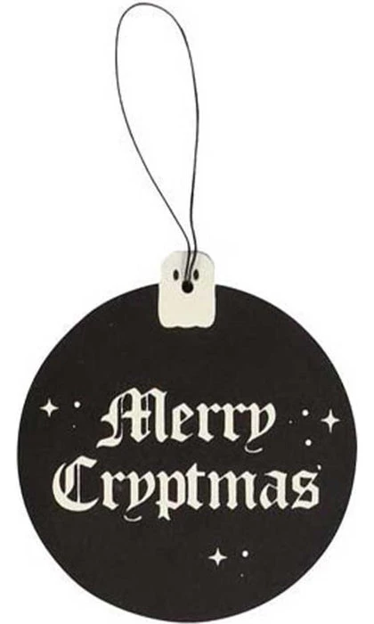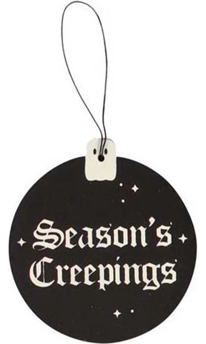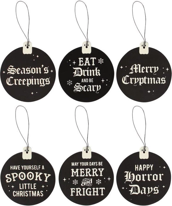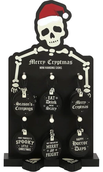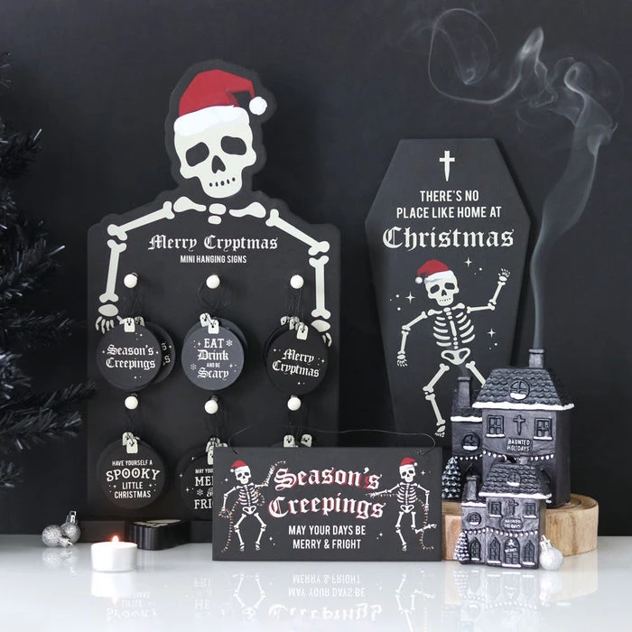 Phrases include; ‘Season’s Creepings’, ‘Eat, Drink and Be Scary’, ‘Merry Cryptmas’, ‘Have Yourself a Spooky Little Christmas’, ‘May Your Days Be Merry and Fright’ and ‘Happy Horrordays’.ย