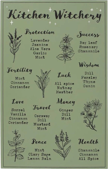 Cottage witches will love this wall plaque of magickal herbs and their uses. Botanical illustrations sit next to common plants used in witchcraft and beyond. Sawtooth hanger on back for easy hanging.ย