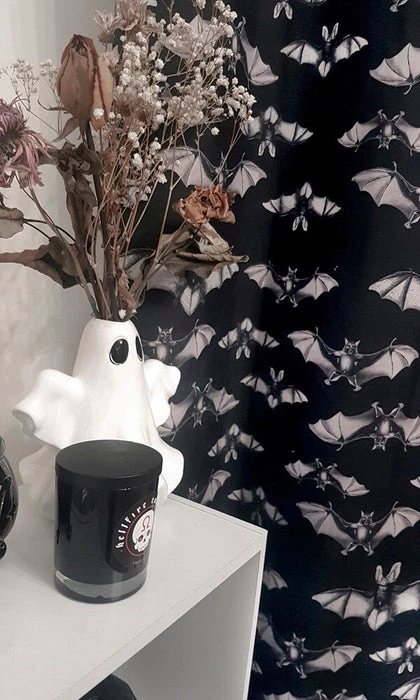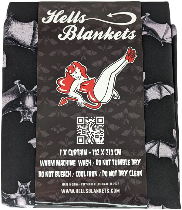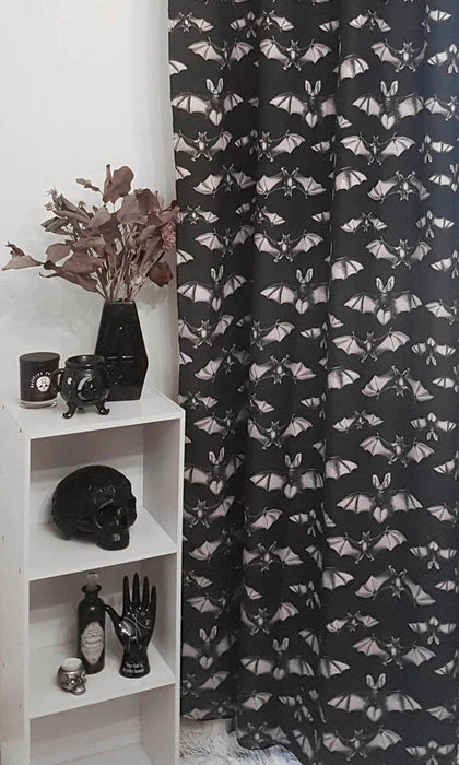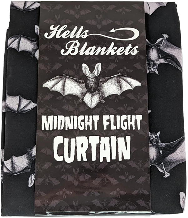 Take flight with Hells’ Blankets Midnight Flight curtain! Featuring a charcoal black curtain with the cutest grey realistic bats all over the place! Perfect to spookify your crypt, bedroom or anywhere your dark heart desires!
