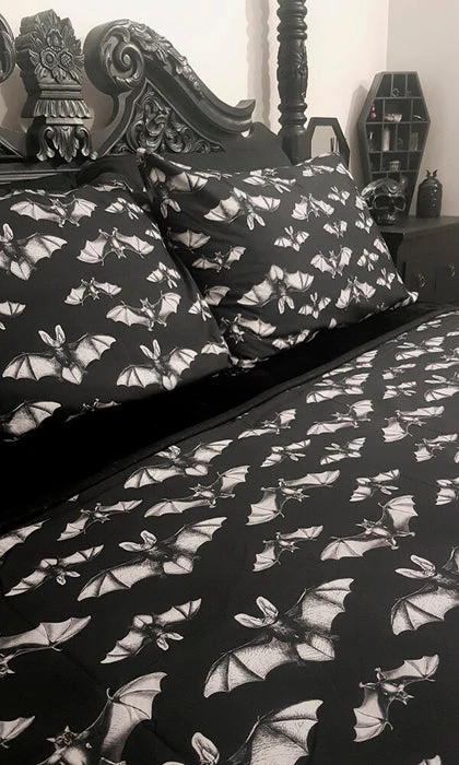 The Midnight Flight Quilt Set brings spooky and macabre vibes to the bedroom. Featuring an all over dark bat design – perfect for anybody who likes to doze on the deadly side!