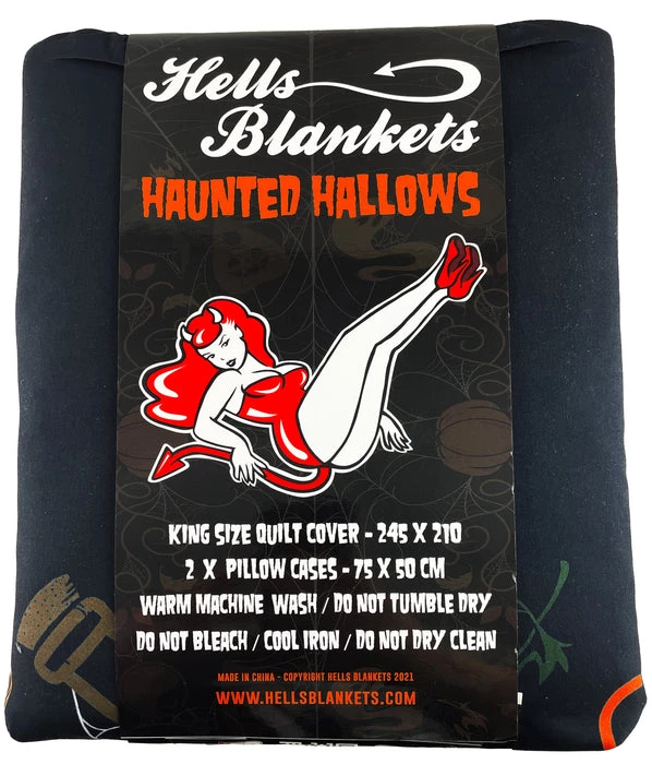 TheΒ Haunted Hallows Quilt SetΒ bringsΒ spookyΒ andΒ macabreΒ vibes to the bedroom.Β FeaturingΒ an all overΒ HalloweenΒ inspiredΒ designΒ – perfect for anybody who likes to doze on the deadly side!Β