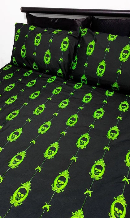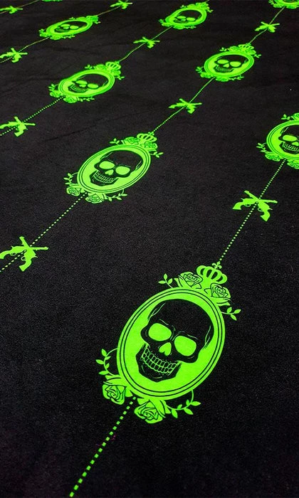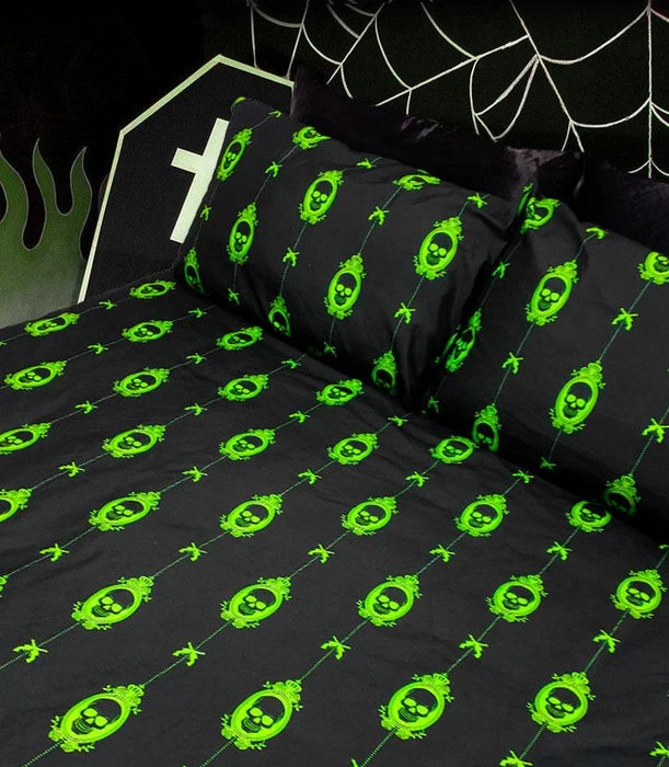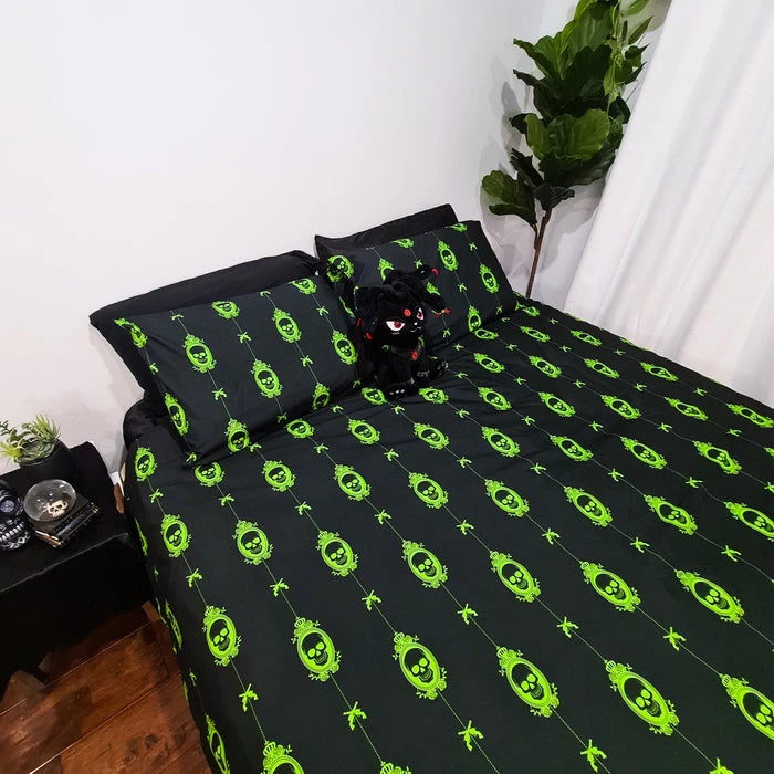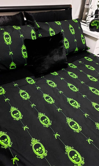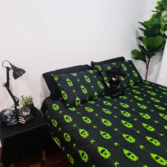 The Poison Nightmare Quilt Setย brings creepy andย macabreย vibes to the bedroom.ย Featuringย skullsย print designย – perfect for anybody who likes to doze on the deadly side!ย