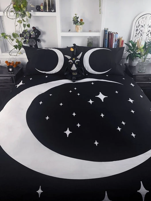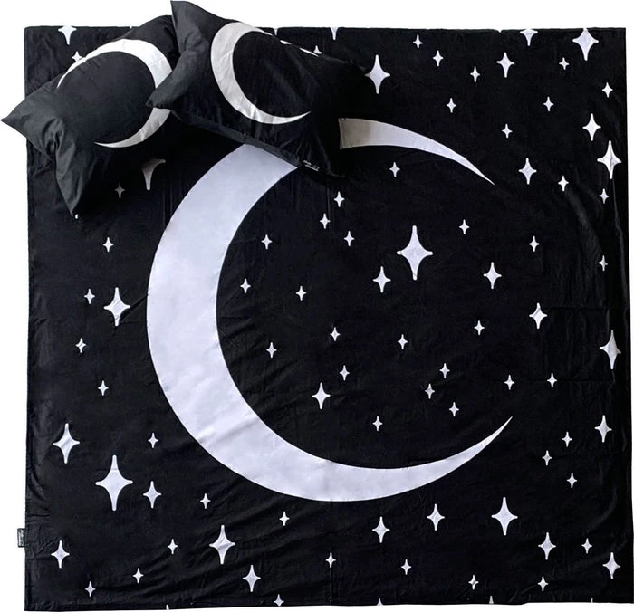 A witch should sleep under the moon, and now you can, without the fuss of taking your whole bedroom outdoors! This witchy Luna Magick Quilt Set from Hell’s Blankets features a massive white crescent moon on it with stars, on an inky black background!