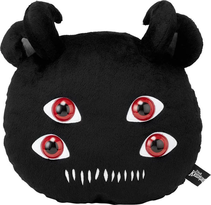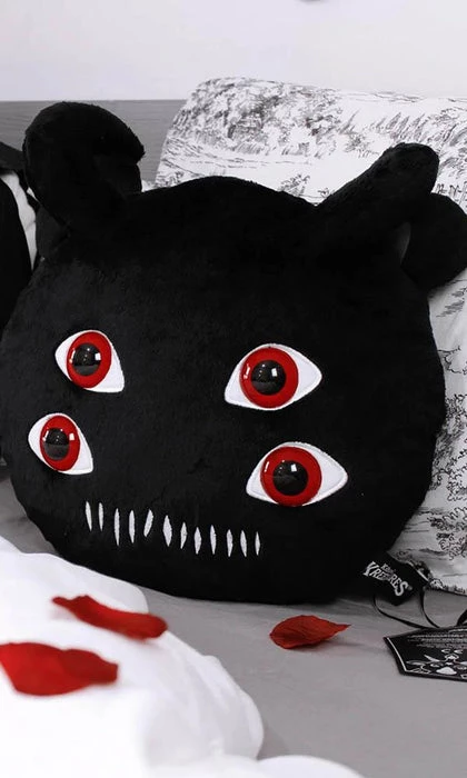 Creatures of the night – let’s party! This decorative ‘Don’t Care’ cushion will match your wardrobe and soul perfectly. Custom shape in super soft faux fleece – featuring two sets of blood-red eyes, ears, horns and an embroidered mouth.