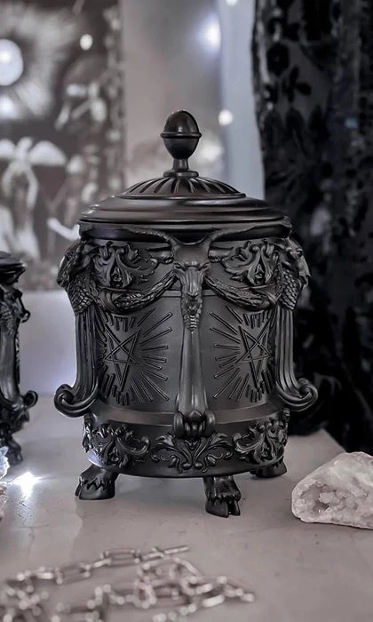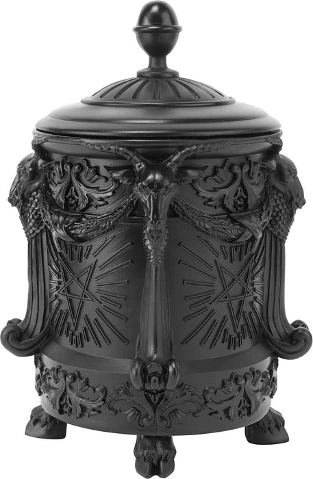 Keep your trinkets and hidden treasures safe with this Baphomet inspired urn. Adorned with intricate details of pentagrams and filigreeย and features goat feet and a removable lid.ย