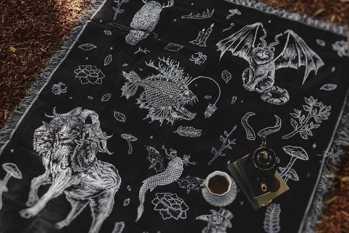 This collection of creatures can be used as a blanket, wall tapestry, ceiling & walls for building a fort, a slightly weighted ghost costume/covering, a shield from the dew droplets on the ground as you sit and have a snazzy picnic amongst other creatures, a baby blanket for a very large child, an invisible cloak if you believe hard enough, etc.