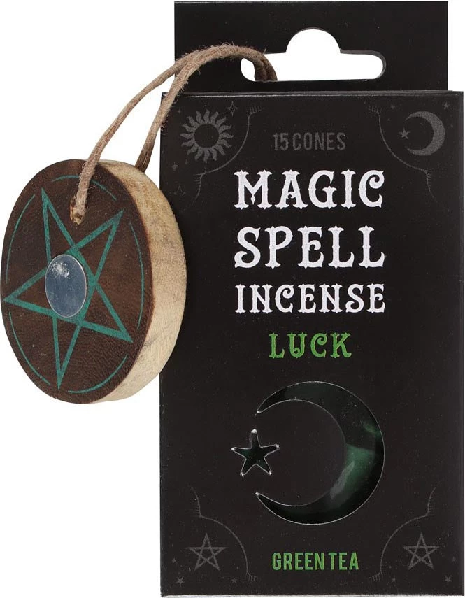 Β This box of magic spell incense includes 15 green tea scented incense cones and a matching wooden pentagram holder that is perfect for accompanying spells of good fortune. Whether used for spell work or everyday enjoyment, this fragrance will attract all things lucky.