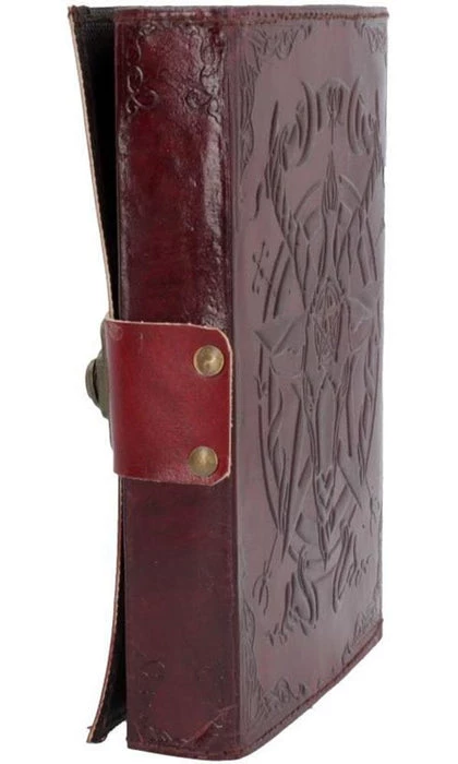 The cover of the journal is decorated with the head of a triple-horned Sabbatic Goat with a pentagram raised from its skull. Underneath the head, there rests a five-pointed pentagram, surrounded by intricate patterns. Above it, a pair of crescent moons sit while below it, the heads of two King cobras are poised to attack.ย This masterpiece is made of high-quality paper and has a leather-bound front cover that features one bronze metal clasp.ย