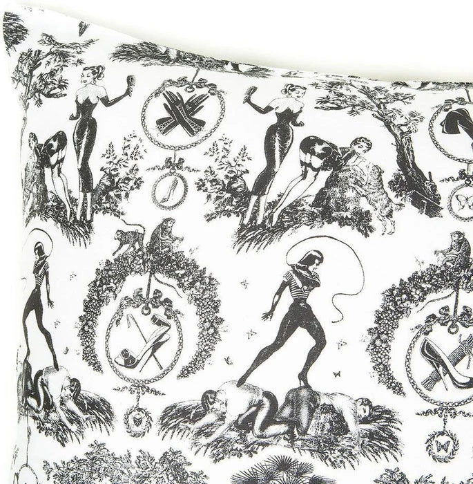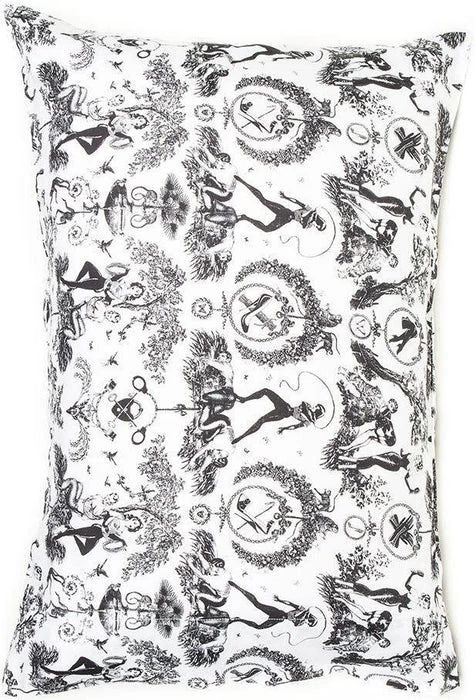 Take a walk on the wild side! The Fetish al Fresco toile print is a pastoral landscape of colonial scenes that will dominate your dreams. At first glance this Victorian toile is a traditional classic, but look closer and you’ll see the scene is at her beck and toile. If you like to play in bed, then it’s time to beg for these pillow cases.