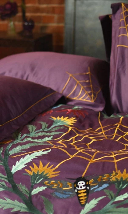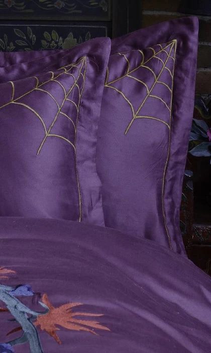 On a deep eggplant base, these Forest Witch Shams have golden spider webs creeping in from the corners, as they do…