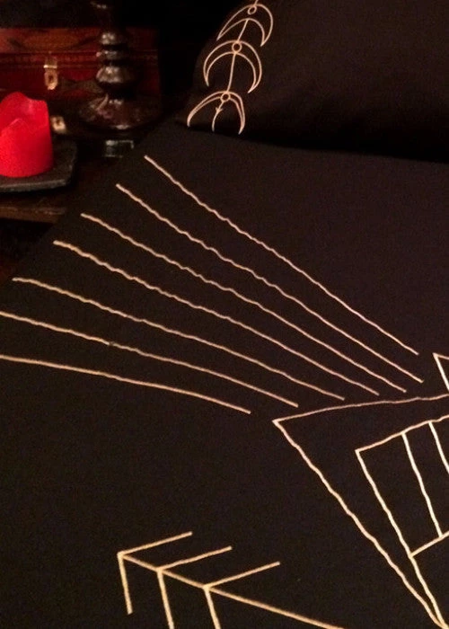 Gold-tone embroidery adorns the pitch black fabric of this duvet cover, covering your bed in ancient designs of the evening sky.