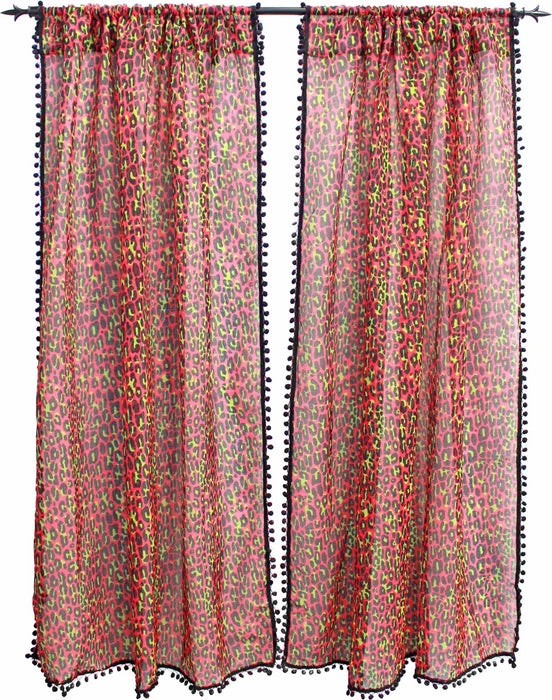 Fallย head over heels in love with the Sourpuss pink leopard window curtains! These fun, bright 60s inspired curtains feature our hot pink leopard print artwork and are trimmed with black pom poms. Each set contains two curtain panels that have a tunnel for your curtain rod. Perfect for any room in your lair!