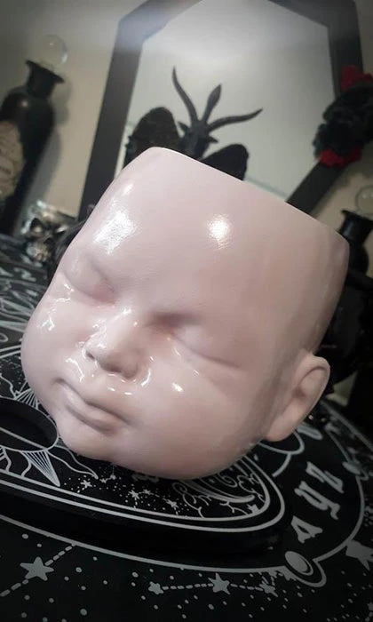Add the ultimate touch of gothic luxury to your crypt with the incredible designs from The Blackened Teeth. Thisย Baby Doll Pot is incredibly detailed and is certain to spook your next guests! This certainly is a gothic forever dream piece.